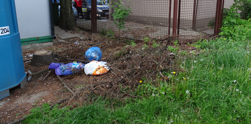 Same gałęzie większego problemu pewnie by nie stanowiły, chociaż na pewno najestetyczniejszym widokiem nie są. Jednak okazało się, że skoro już coś leży, to można koło tego położyć coś jeszcze. Takie prawo natury, które co prawda nigdy nie zostało opisane należycie, ale istnieje od wieków: śmieci przyciągają kolejne śmieci i jeszcze więcej śmieci.