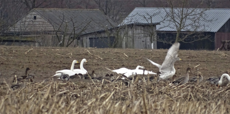 W Śniechach, w gminie Mochowo, na polu po kukurydzy odpoczywało stado łabędzi krzykliwych i gęsi. Początkowo sądziliśmy, że to są łabędzie nieme, ale ich dzioby były inne, w czarnym kolorze, z żółtą nasadą sięgającą klinem do połowy jego długości. Miały też wyprostowane szyje.