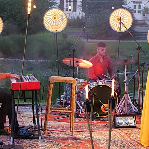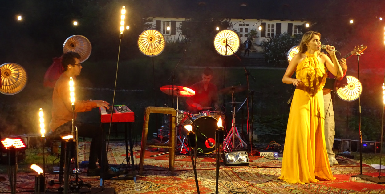 Stare dywany stanowiły scenę, ogień i blask żarowego światła zastąpiły tradycyjne oświetlenie, a ławki i koce posłużyły za teatralne fotele. Rośliny, staw i mazowiecki dworek tworzyły wyjątkową dekorację dla projektu kulturalnego — koncertu „Od nocy do nocy”.