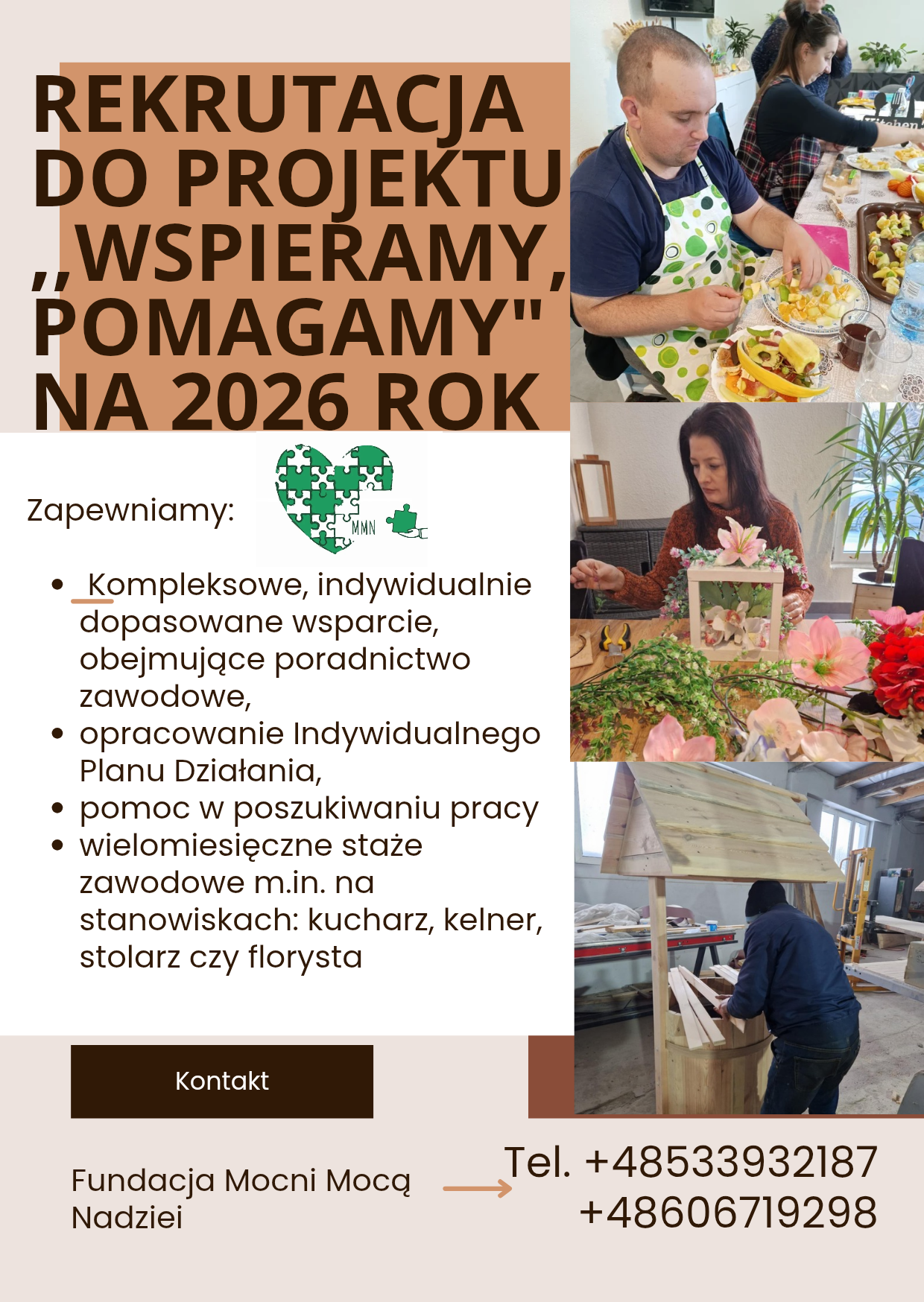 Obecnie prowadzona jest rekrutacja na 2026 rok. Fundacja Mocni Mocą Nadziei zaprasza 10 osób posiadających orzeczenie o stopniu niepełnosprawności do udziału w projekcie. Projekt „Wspieramy Pomagamy!” to realna inwestycja w samodzielność, aktywność zawodową i integrację społeczną osób z niepełnosprawnościami w lokalnych społecznościach.