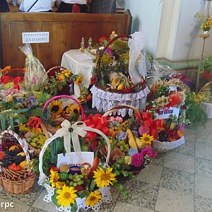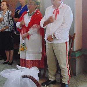 Podczas nabożeństwa poświęcono dożynkowy chleb i wieniec wykonany przez Koło Gospodyń i Gospodarzy Wiejskich z Blinna.