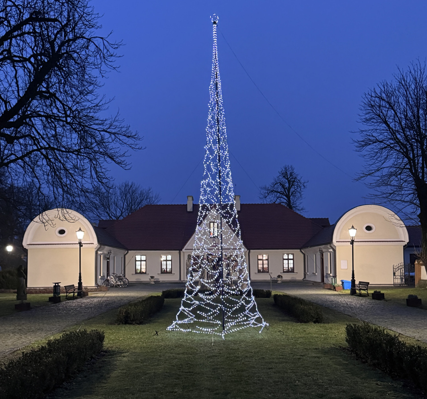 W Rościszewie pojawiły się świąteczne dekoracje. Przed Urzędem Gminy stanęła choinka rozświetlona białymi lampkami, widoczna po zmroku z głównego ciągu komunikacyjnego.